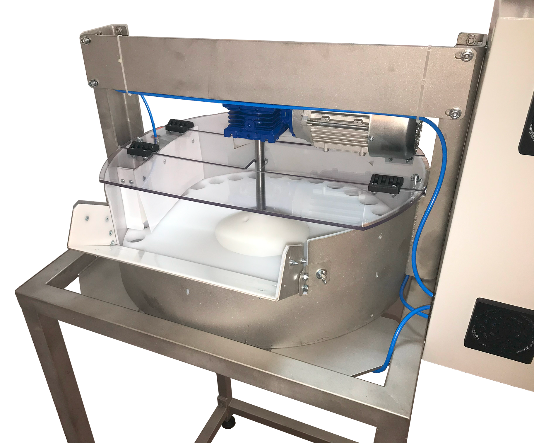 Podajnik składa się z bębna i umieszczonej w nim obrotowej tarczy odśrodkowej wyposażonej w otwory, do których wpadają przedmioty. Następnie są one wydmuchiwane przez otwór w spodzie podajnika, gdzie przelatują przez pole widzenia czujnika optycznego, który w ten sposób je podlicza. Bęben jest zabezpieczony od góry przez pokrywę, która zapobiega dostaniu się do środka liczarki obiektów niepożądanych.